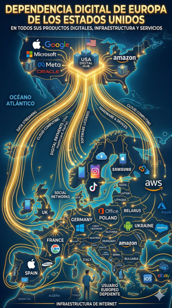 En un escenario de conflicto o guerra comercial, nuestra fragilidad es absoluta. Nuestros dispositivos móviles son Android o Apple; nuestros ordenadores funcionan con Windows o macOS. Con una sola orden ejecutiva desde el Despacho Oval, la digitalidad europea podría, simplemente, apagarse.